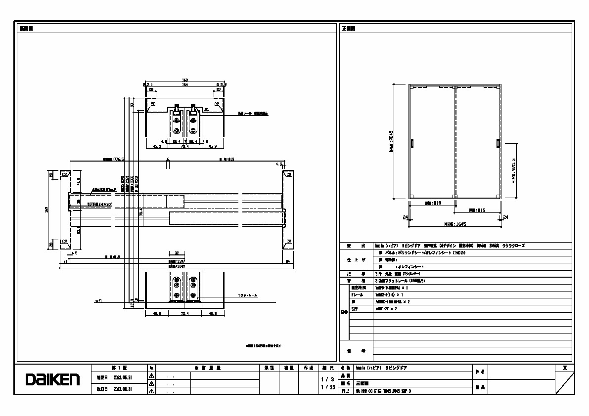 キャプション 1645幅 2045高 引手 角座 空錠 フラットレール(1645幅用) 三面図