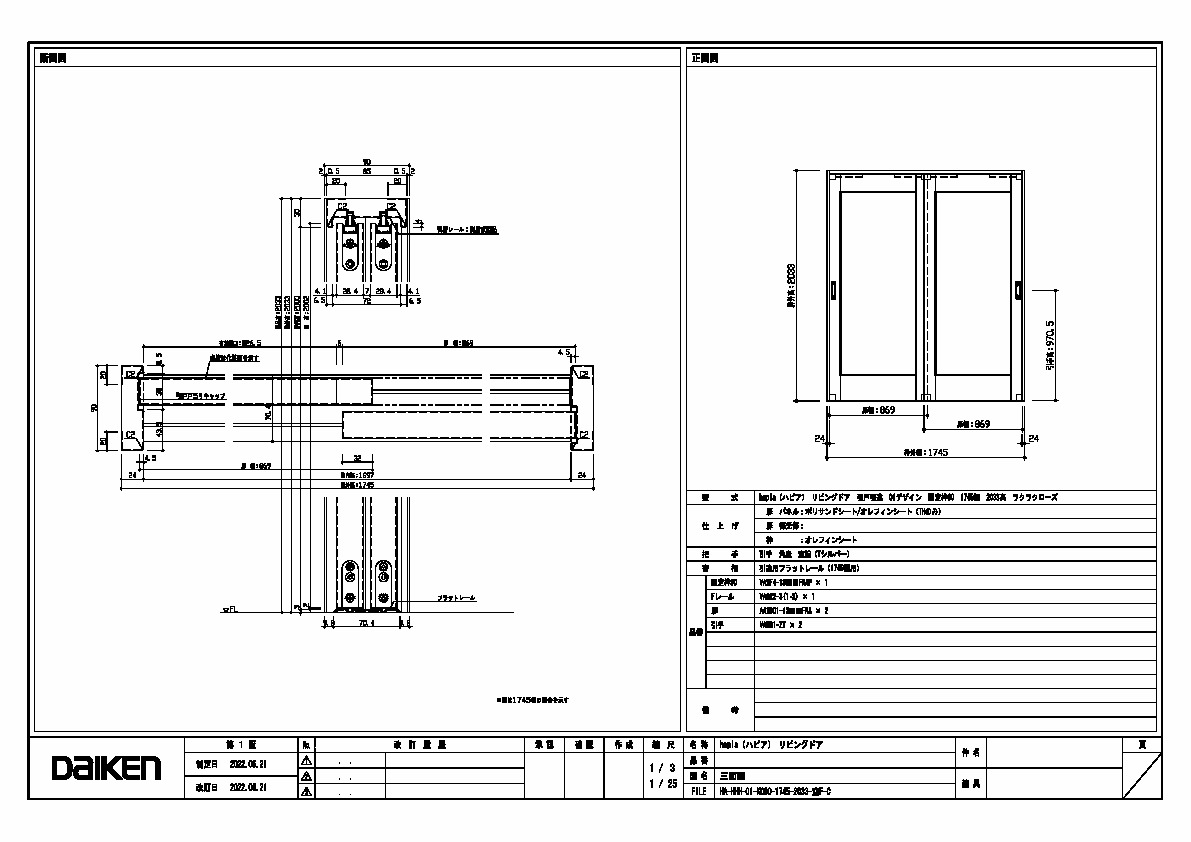 | キャプション | 1745幅 2033高 引手 角座 空錠 フラットレール(1745幅用) 三面図 |