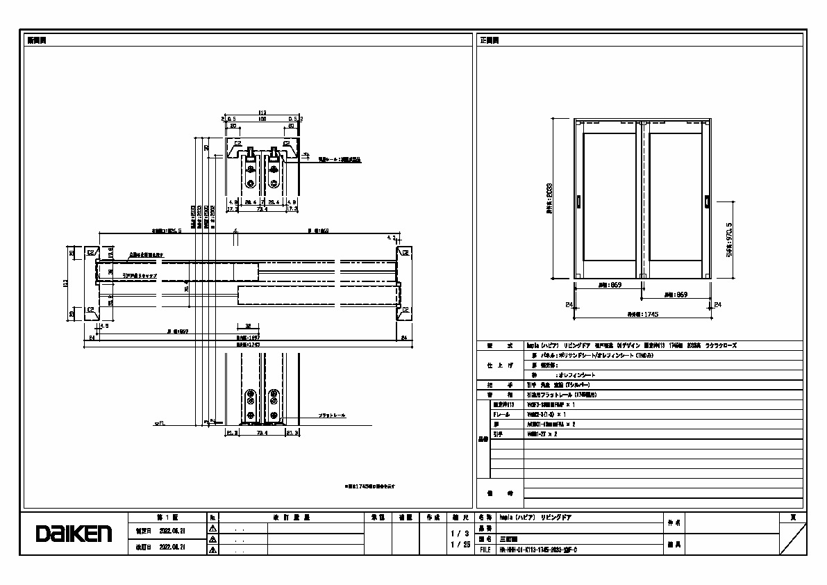 | キャプション | 1745幅 2033高 引手 角座 空錠 フラットレール(1745幅用) 三面図 |