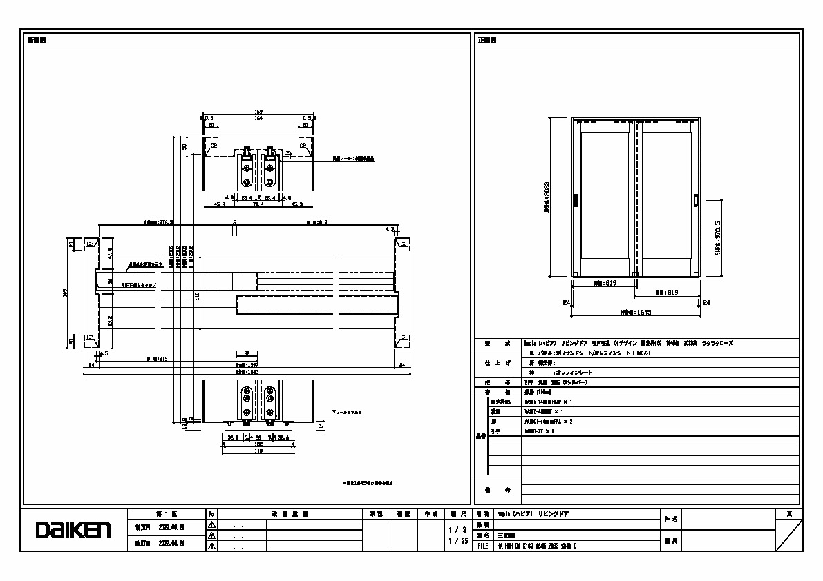 | キャプション | 1645幅 2033高 引手 角座 空錠 敷居(110mm) 三面図 |