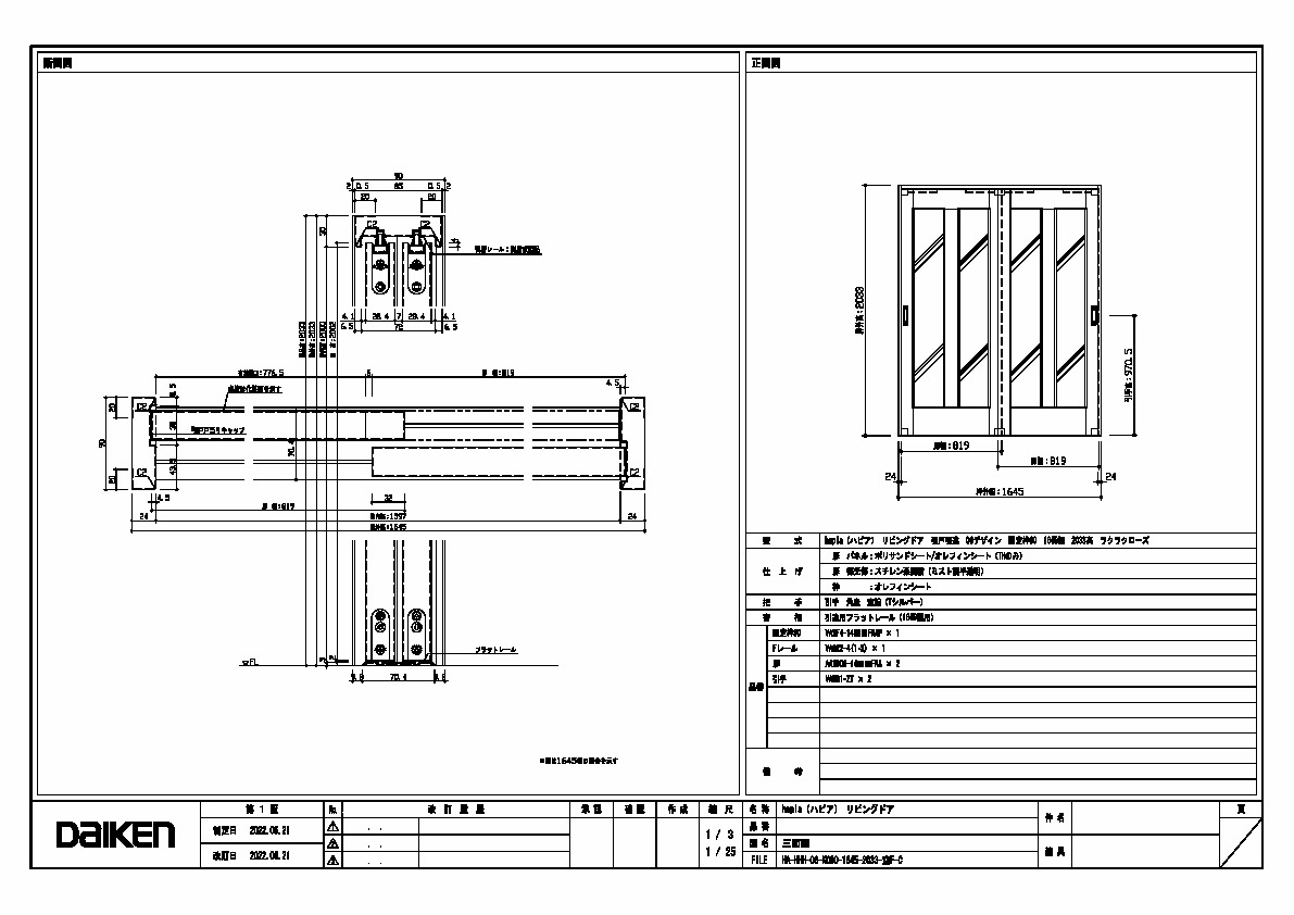 キャプション 1645幅 2033高 引手 角座 空錠 フラットレール(1645幅用) 三面図