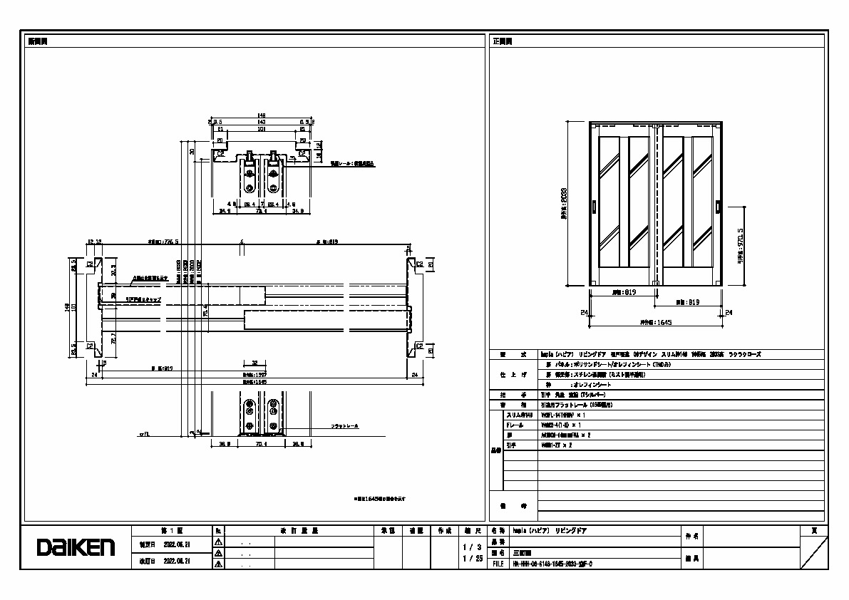 | キャプション | 1645幅 2033高 引手 角座 空錠 フラットレール(1645幅用) 三面図 |