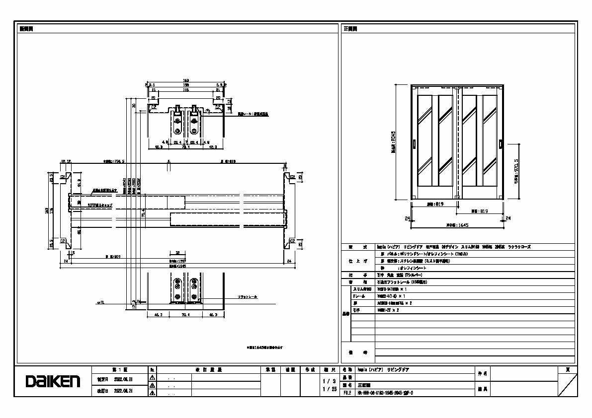 | キャプション | 1645幅 2045高 引手 角座 空錠 フラットレール(1645幅用) 三面図 |