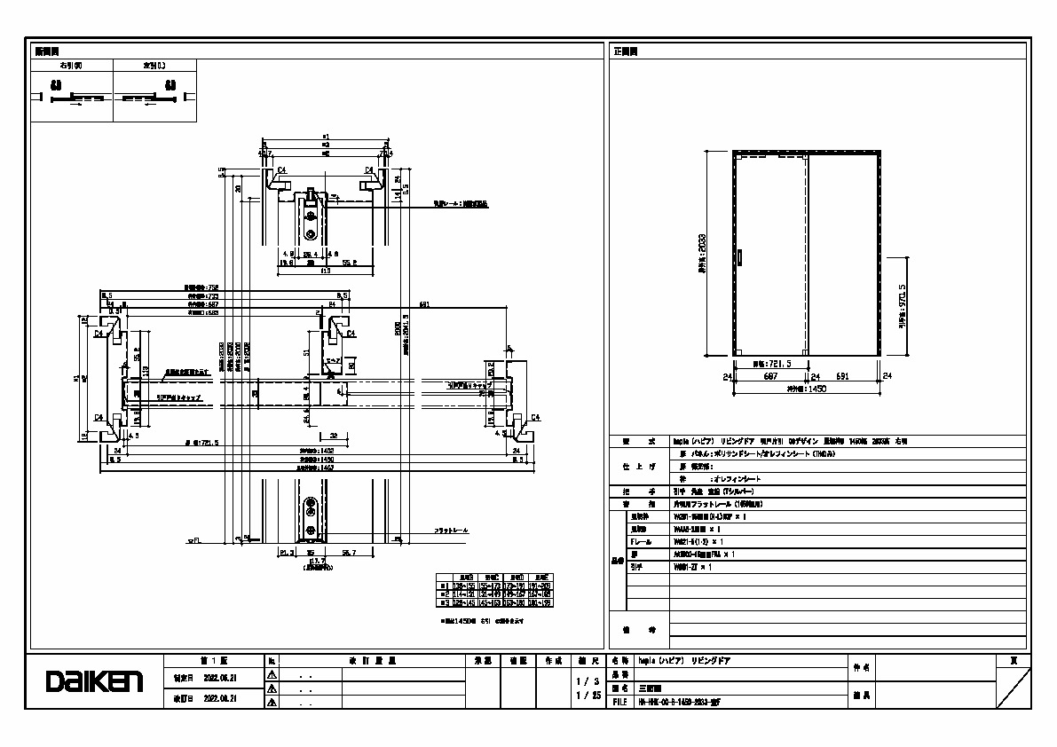 | キャプション | 1450幅 2033高 引手 角座 空錠 フラットレール(1450幅用) 三面図 |