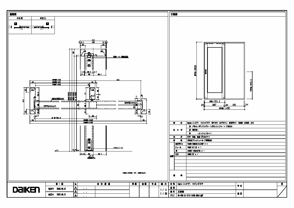 | キャプション | 1450幅 2033高 引手 角座 空錠 フラットレール(1450幅用) 三面図 |