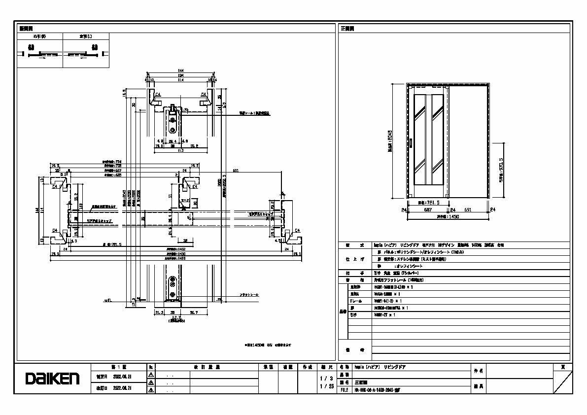 | キャプション | 1450幅 2045高 引手 角座 空錠 フラットレール(1450幅用) 三面図 |