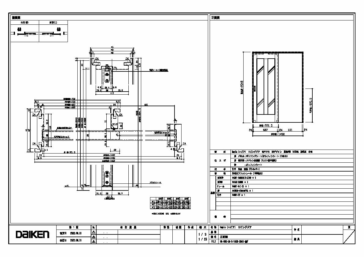 | キャプション | 1450幅 2045高 引手 角座 空錠 フラットレール(1450幅用) 三面図 |