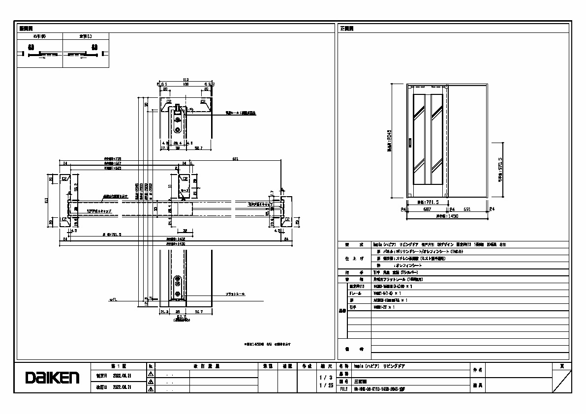 | キャプション | 1450幅 2045高 引手 角座 空錠 フラットレール(1450幅用) 三面図 |