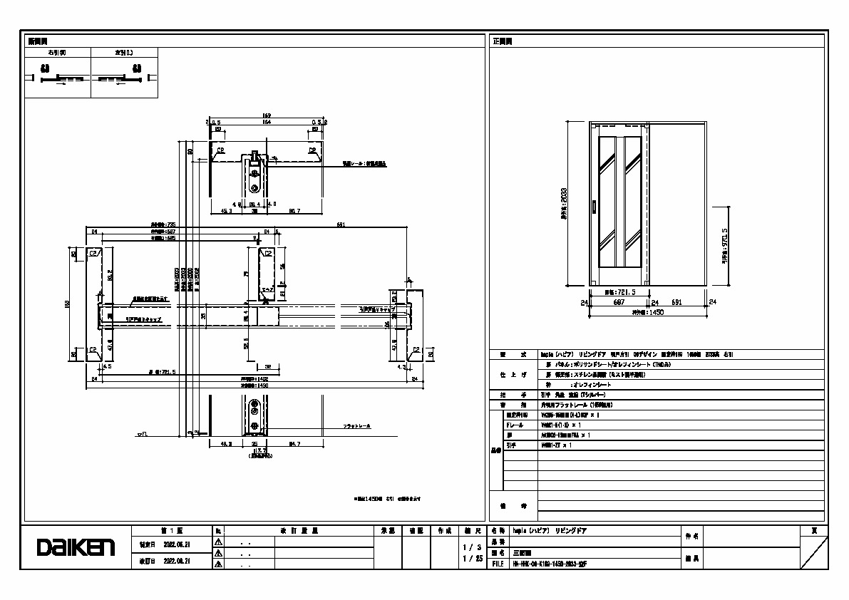 | キャプション | 1450幅 2033高 引手 角座 空錠 フラットレール(1450幅用) 三面図 |
