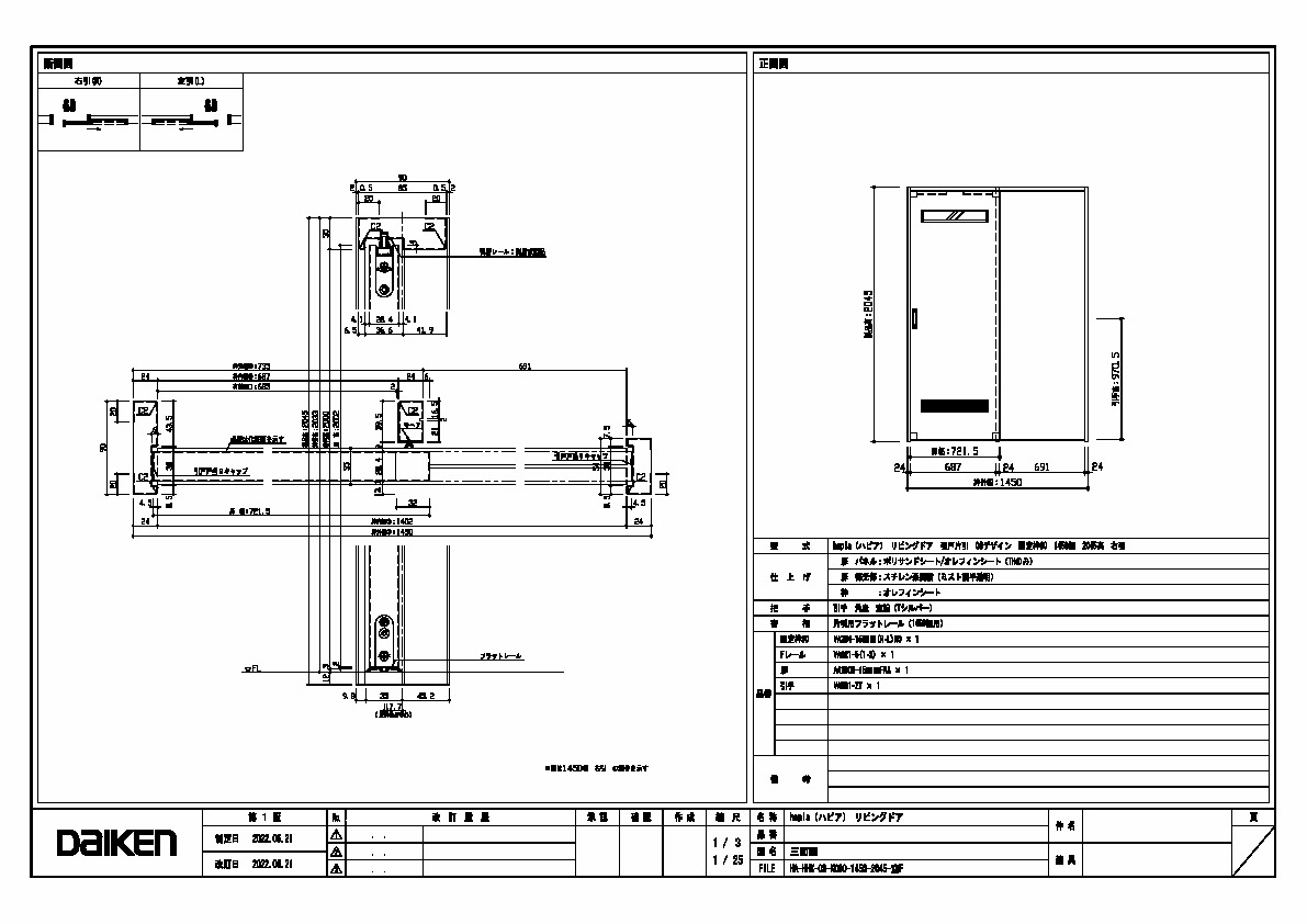 | キャプション | 1450幅 2045高 引手 角座 空錠 フラットレール(1450幅用) 三面図 |