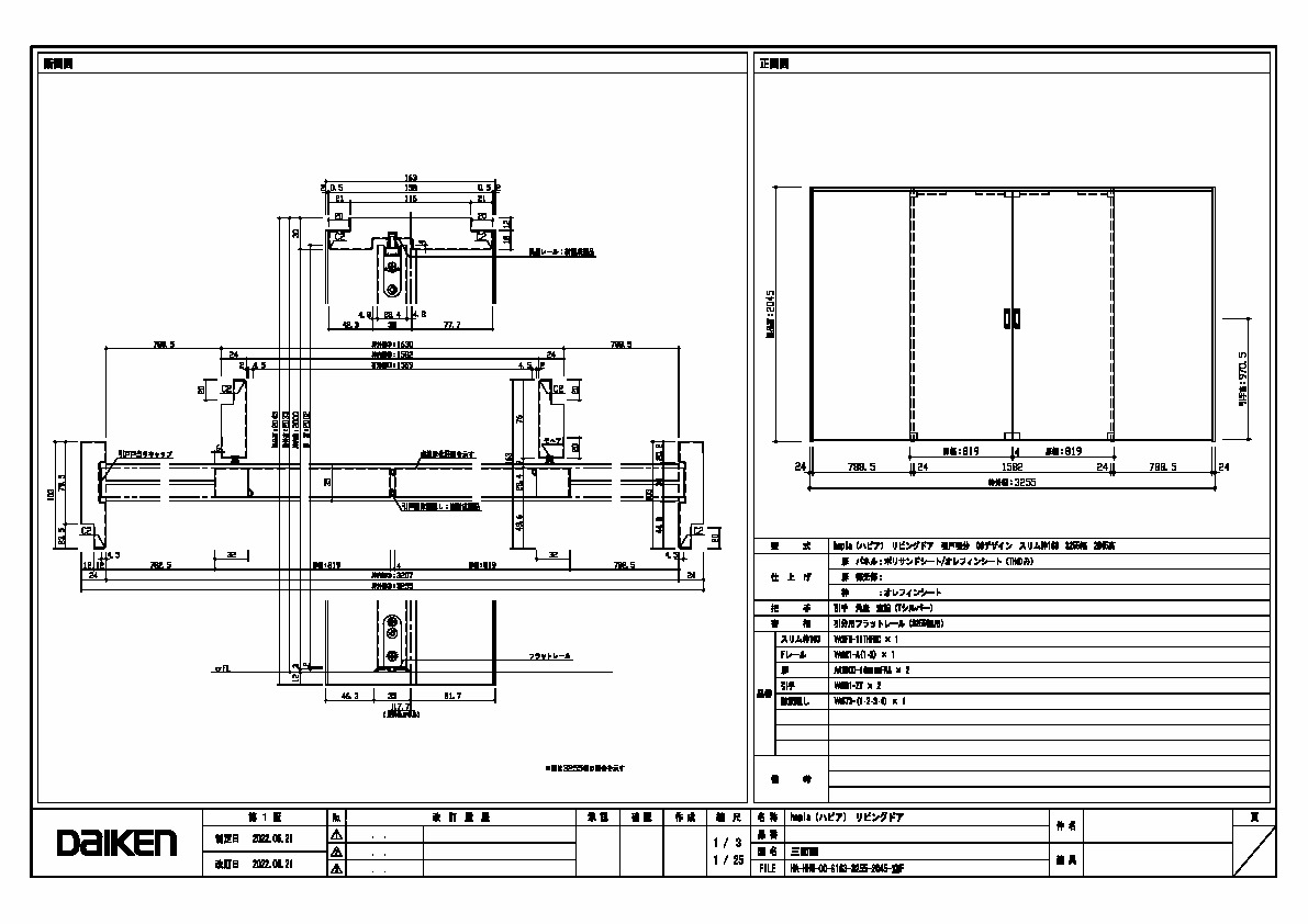 | キャプション | 3255幅 2045高 引手 角座 空錠 フラットレール(3255幅用) 三面図 |