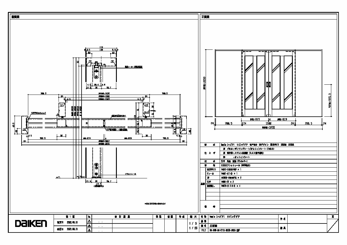 | キャプション | 3255幅 2033高 引手 角座 空錠 フラットレール(3255幅用) 三面図 |
