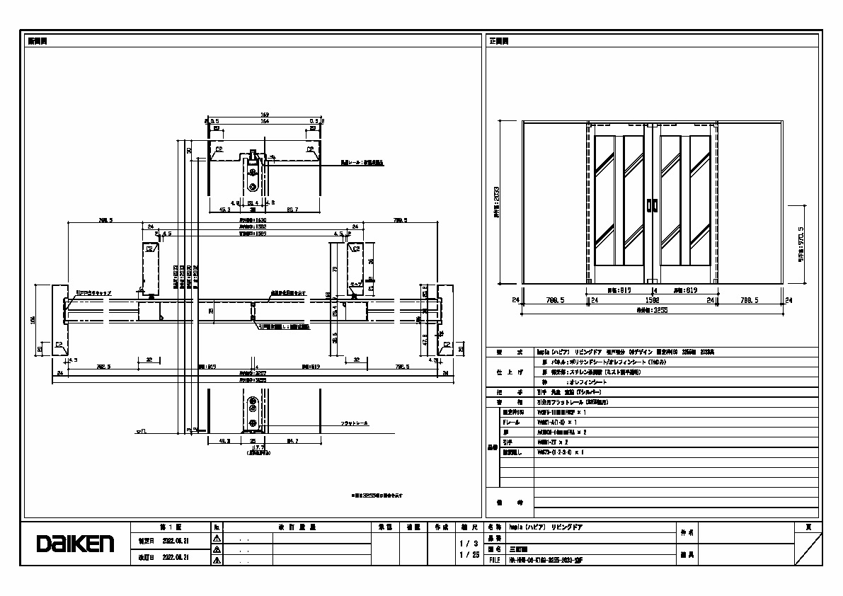 | キャプション | 3255幅 2033高 引手 角座 空錠 フラットレール(3255幅用) 三面図 |