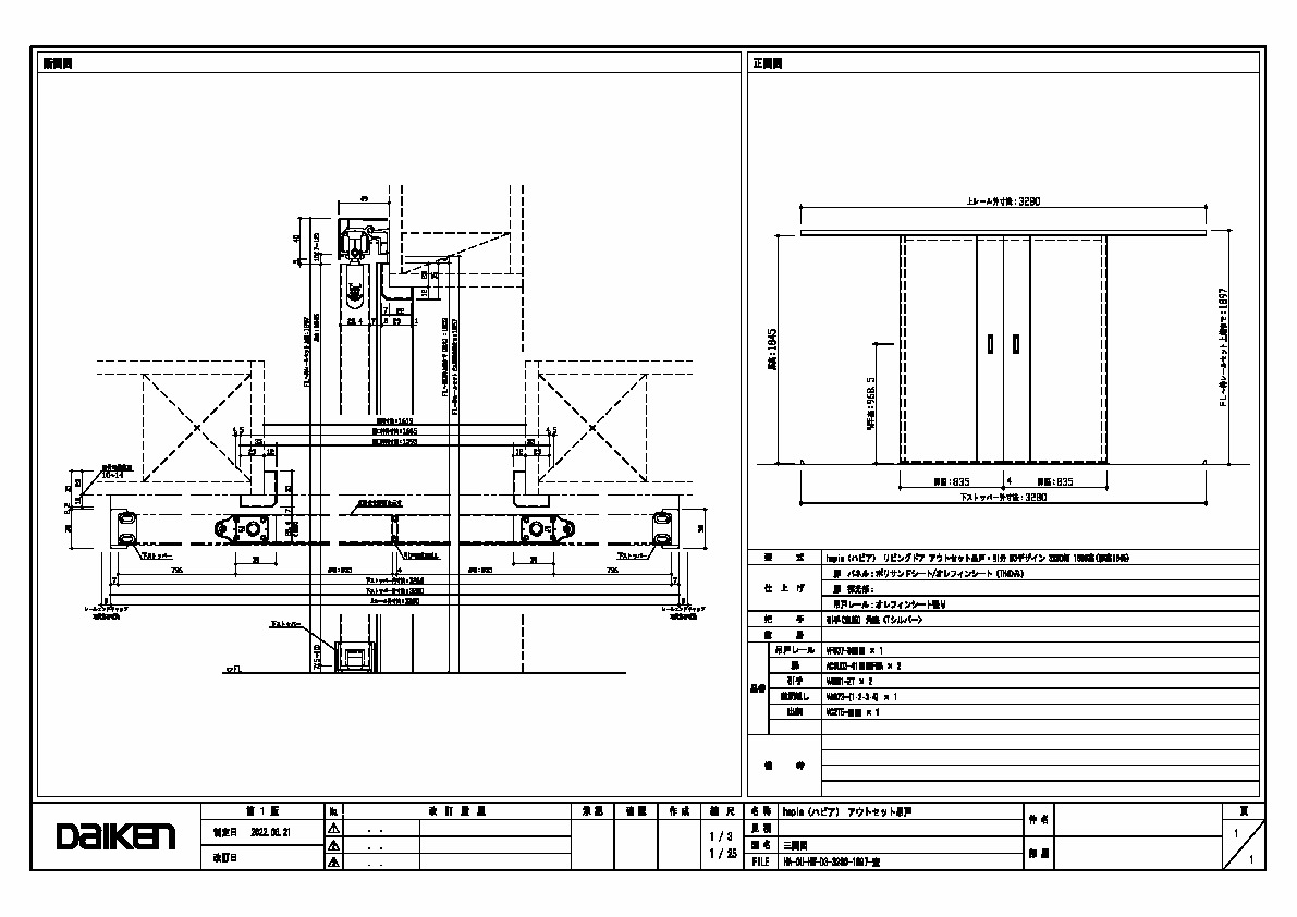 「ずっと ここちいいね」を実現する企業 DAIKEN 建材製品情報 図面 データ検索 pdf Z_D_2022-HA-OU-HW-D3-3280-1897-K-1.pdf webp Z_D_2022-HA-OU-HW-D3-3280-1897-K-1.webp 製品図 3280幅 1800高 空錠 三面図 データ分類_第1分類 図面 データ分類_第2分類 室内ドア データ分類_第3分類 hapia アウトセットドア データ分類_第4分類 アウトセット吊戸・引分 データ分類_第5分類 D3 ファイル種類 製品図 見出し 製品図 キャプション 3280幅 1800高 空錠 三面図 改定日 2022/06/21 備考