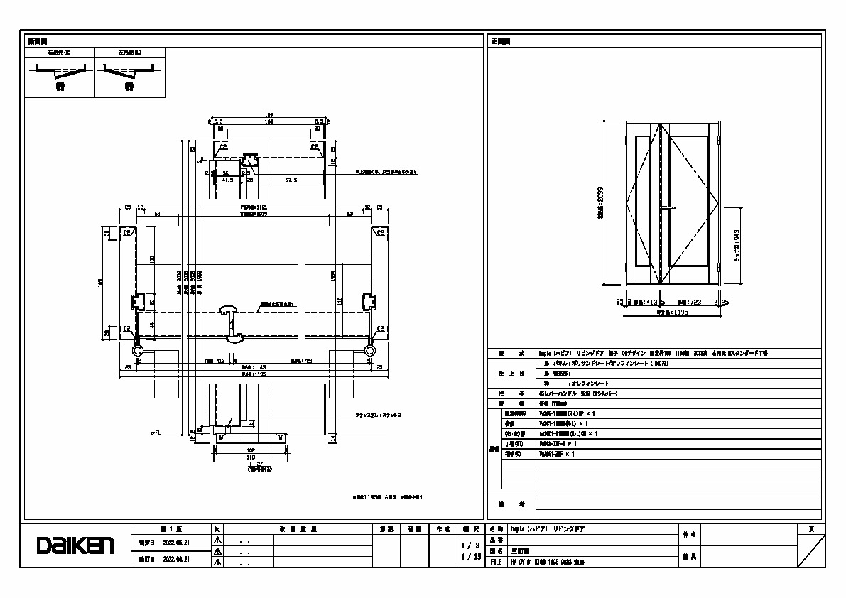 | キャプション | 1195幅 2033高 85ハンドル 空錠 沓摺(110mm) 三面図 |