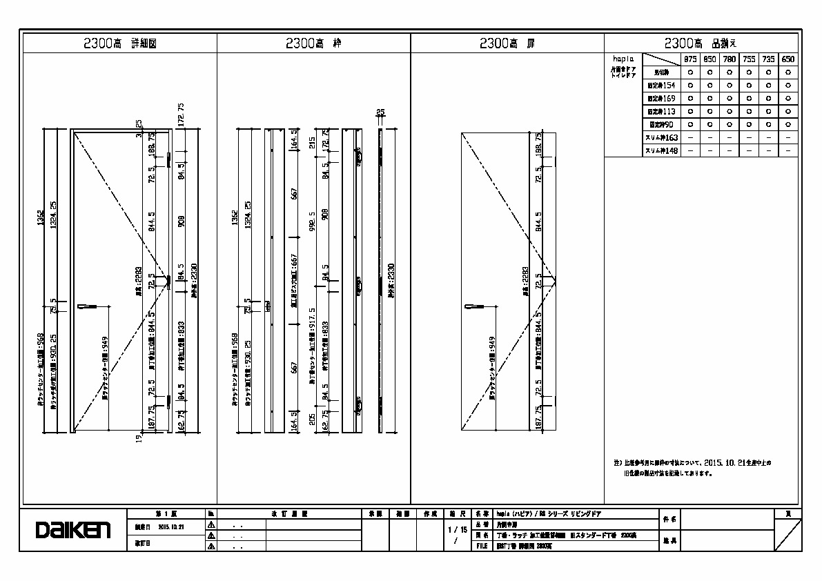 「ずっと ここちいいね」を実現する企業 DAIKEN 建材製品情報 図面 データ検索 pdf Z_D_2022-HA-ST-2300-1.pdf webp Z_D_2022-HA-ST-2300-1.webp 製品図 旧仕様スタンダード丁番 2300高 詳細図 データ分類_第1分類 図面 データ分類_第2分類 室内ドア データ分類_第3分類 リビングドア オプション 開き戸 データ分類_第4分類 丁番 ファイル種類 製品図 見出し 製品図 キャプション 旧仕様スタンダード丁番 2300高 詳細図 改定日 2022/06/21 備考
