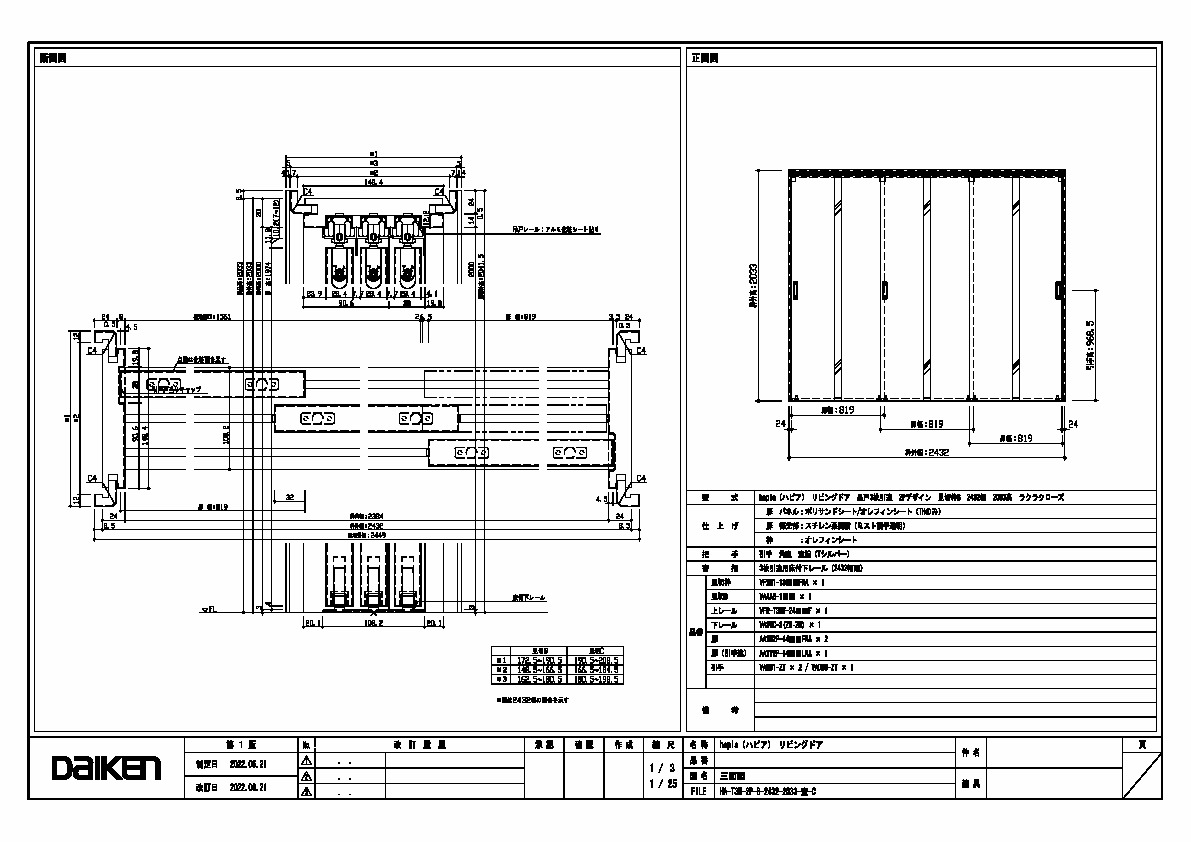 | キャプション | 2432幅 2033高 引手 角座 空錠 3枚引違用床付下レール(2432幅用) 三面図 |
