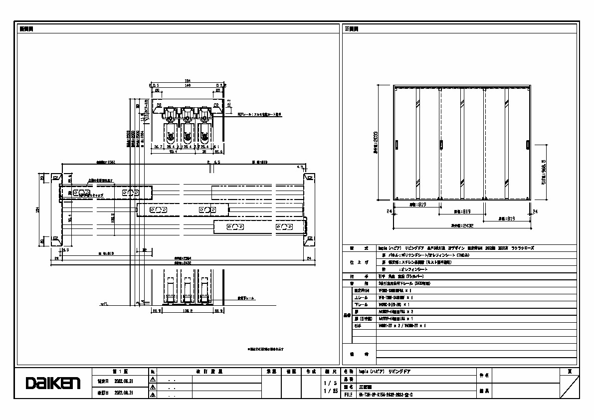| キャプション | 2432幅 2033高 引手 角座 空錠 3枚引違用床付下レール(2432幅用) 三面図 |