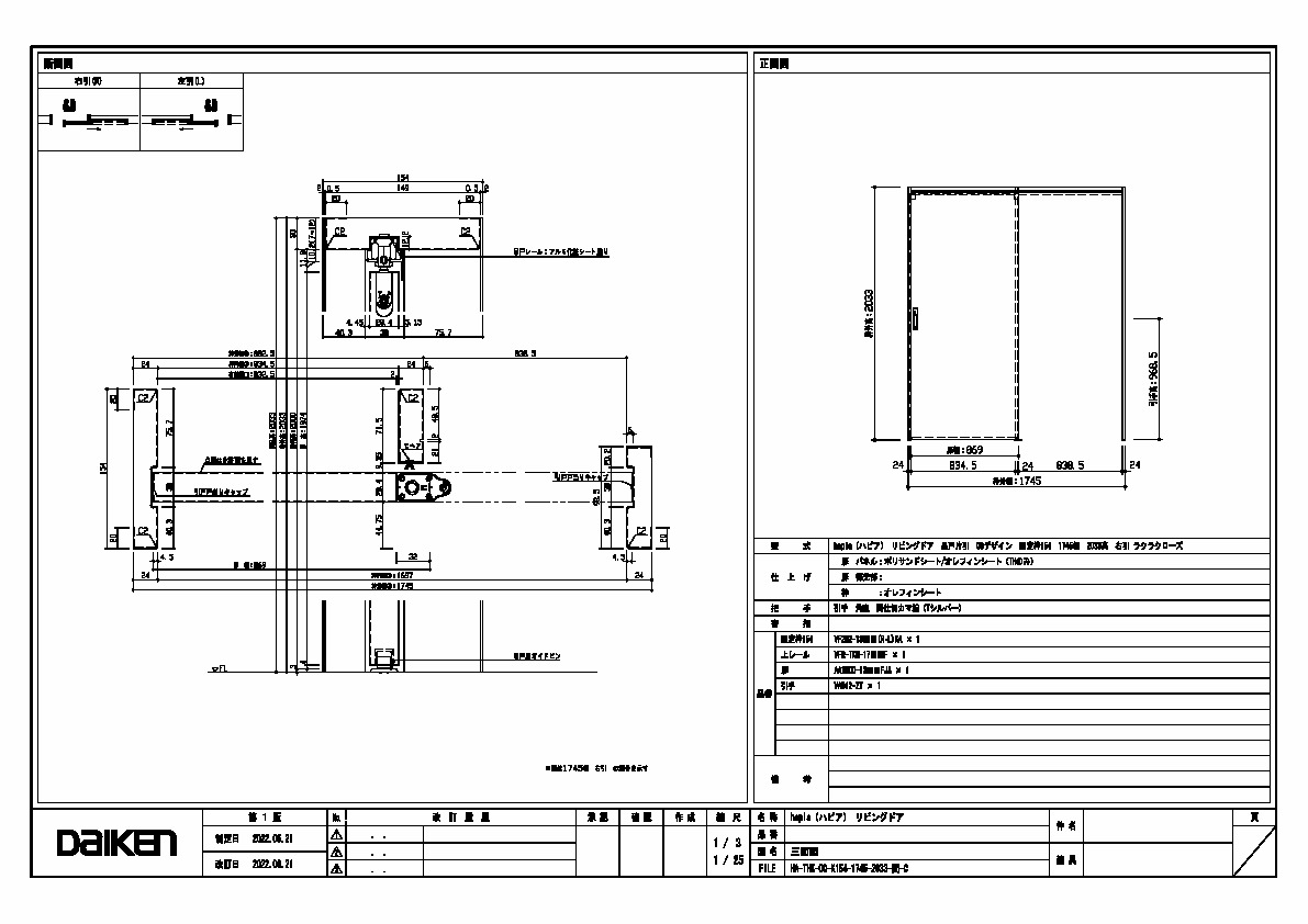| キャプション | 1745幅 2033高 引手 角座 間仕切錠 三面図 |