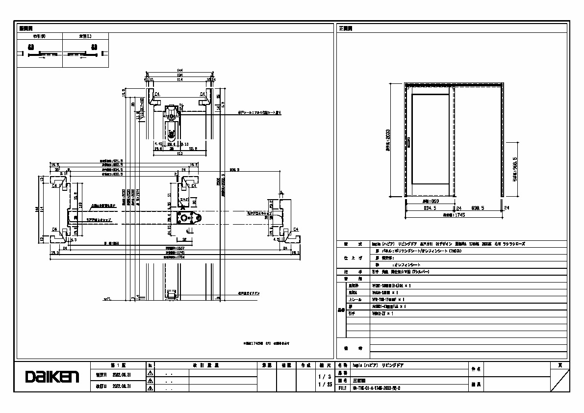 | キャプション | 1745幅 2033高 引手 角座 間仕切錠 三面図 |