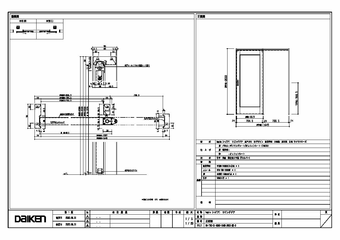 | キャプション | 1645幅 2033高 引手 角座 間仕切錠 三面図 |