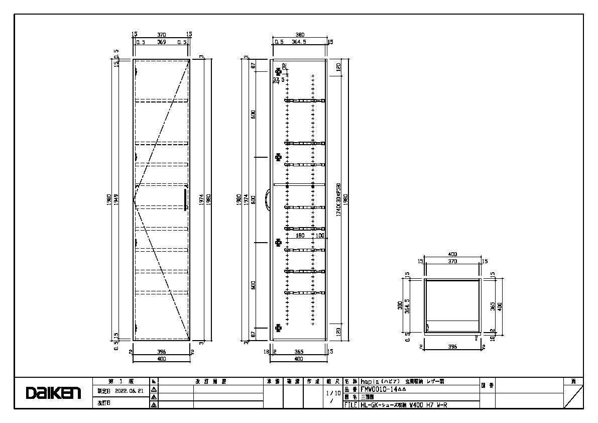 | キャプション | シューズ収納 400幅 H7 三面図 |