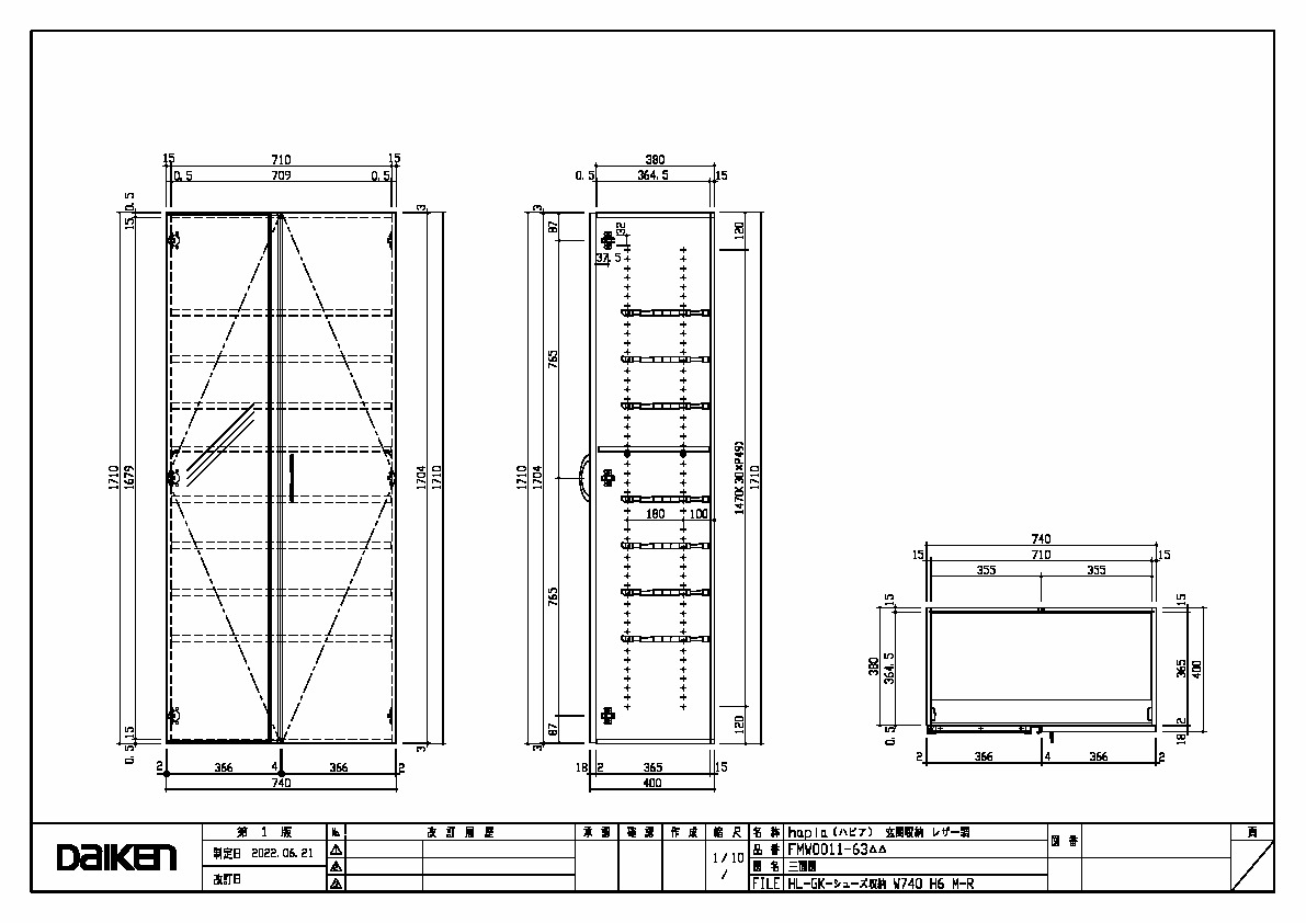 | キャプション | シューズ収納 740幅 H6 三面図 |