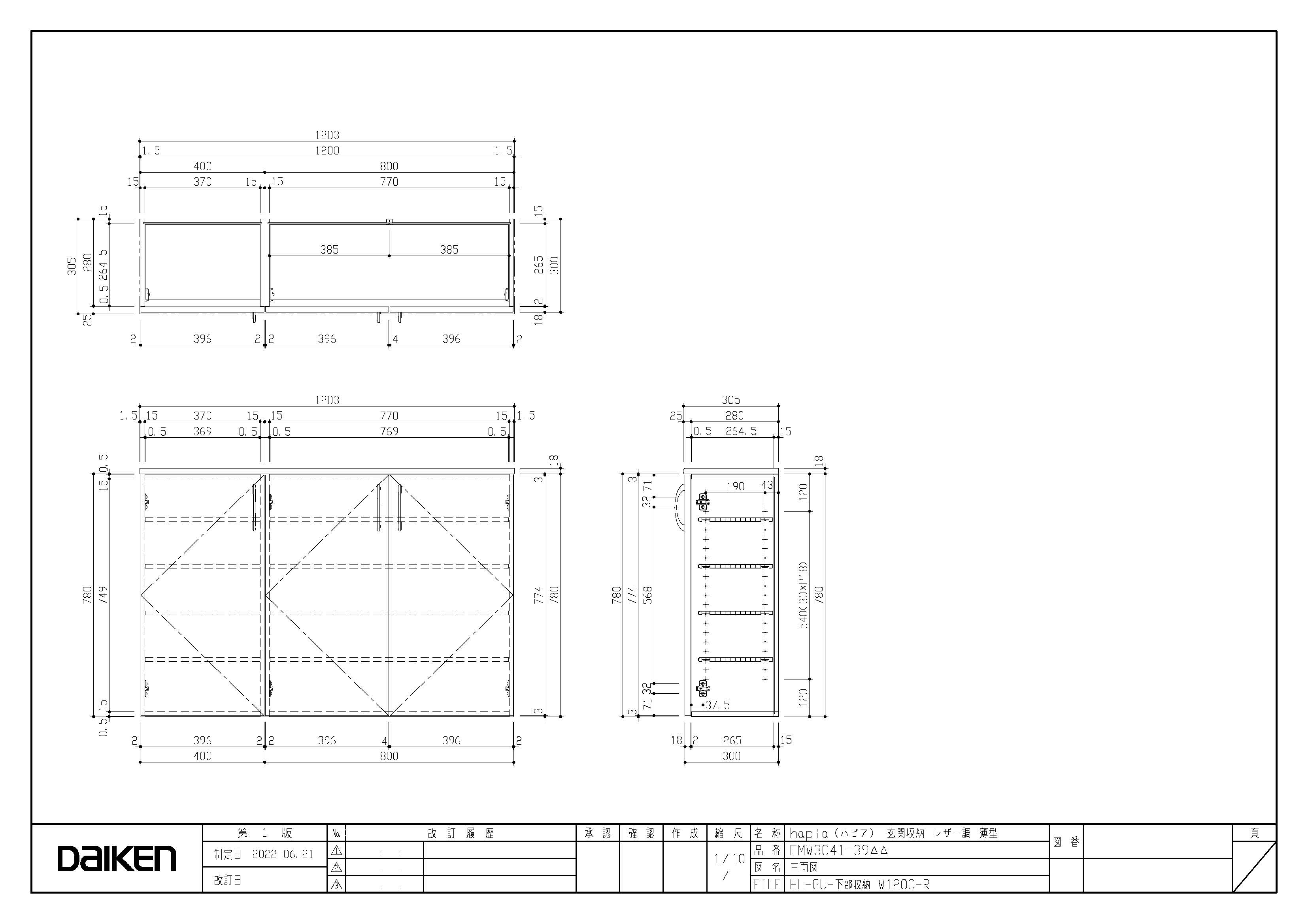 | キャプション | 下部収納 1200幅 三面図 |