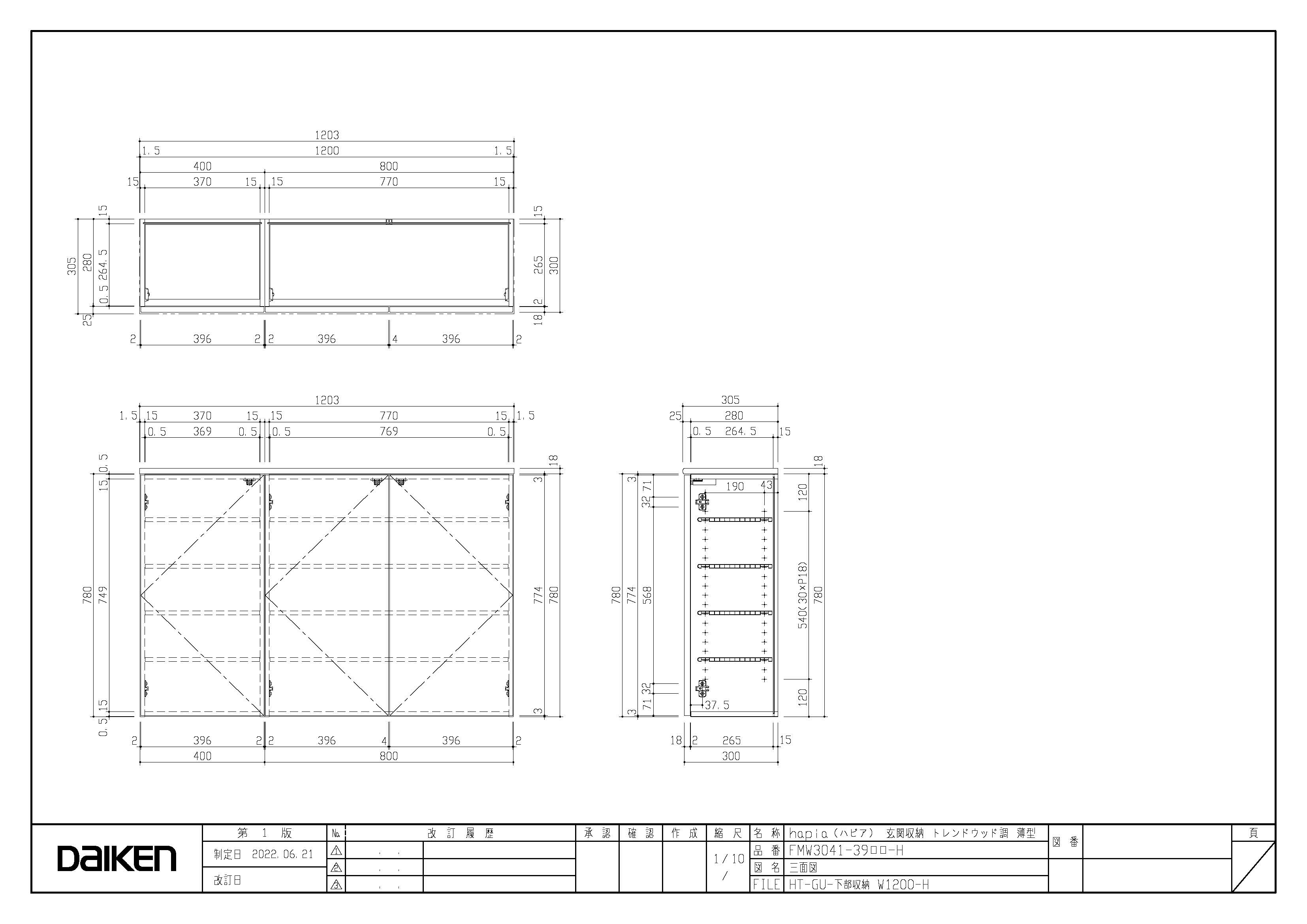 | キャプション | 下部収納 1200幅 三面図 |
