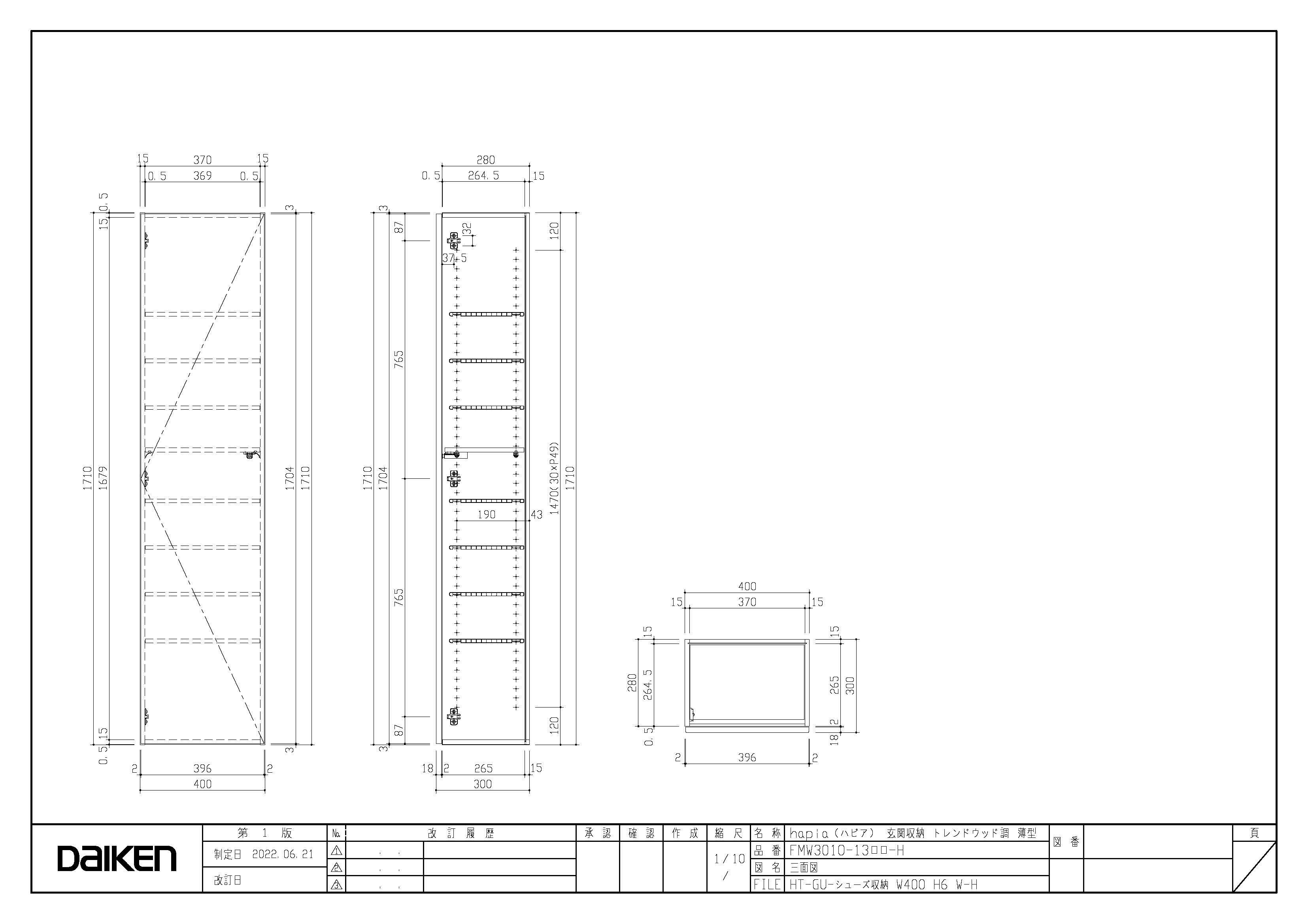 | キャプション | シューズ収納 400幅 H6 三面図 |