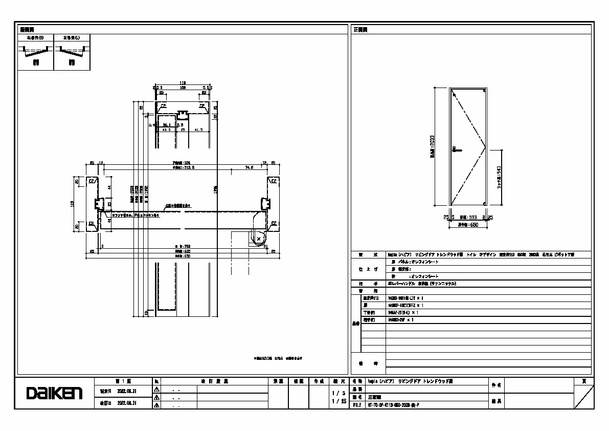 | キャプション | 650幅 2033高 85ハンドル 表示錠 三面図 |