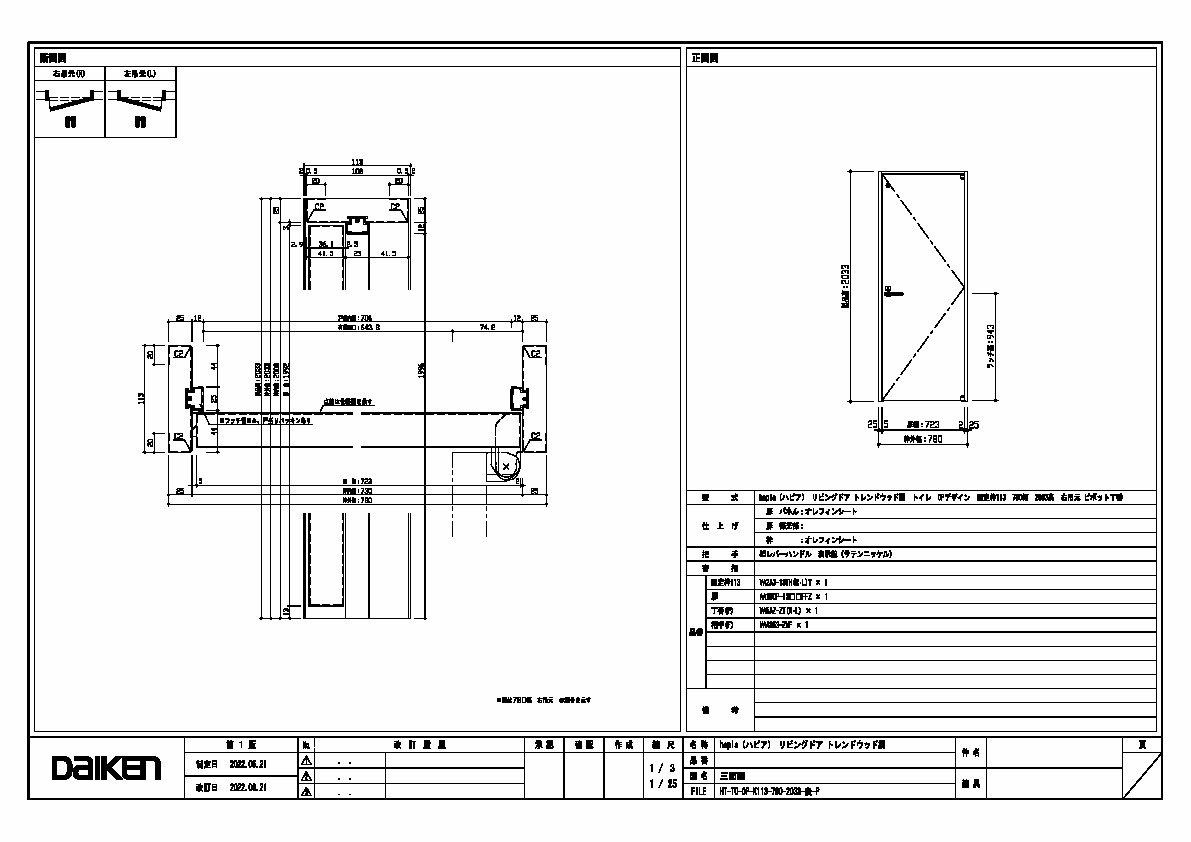 キャプション 780幅 2033高 85ハンドル 表示錠 三面図