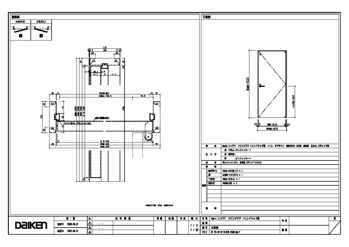 | キャプション | 875幅 2033高 85ハンドル 表示錠 三面図 |