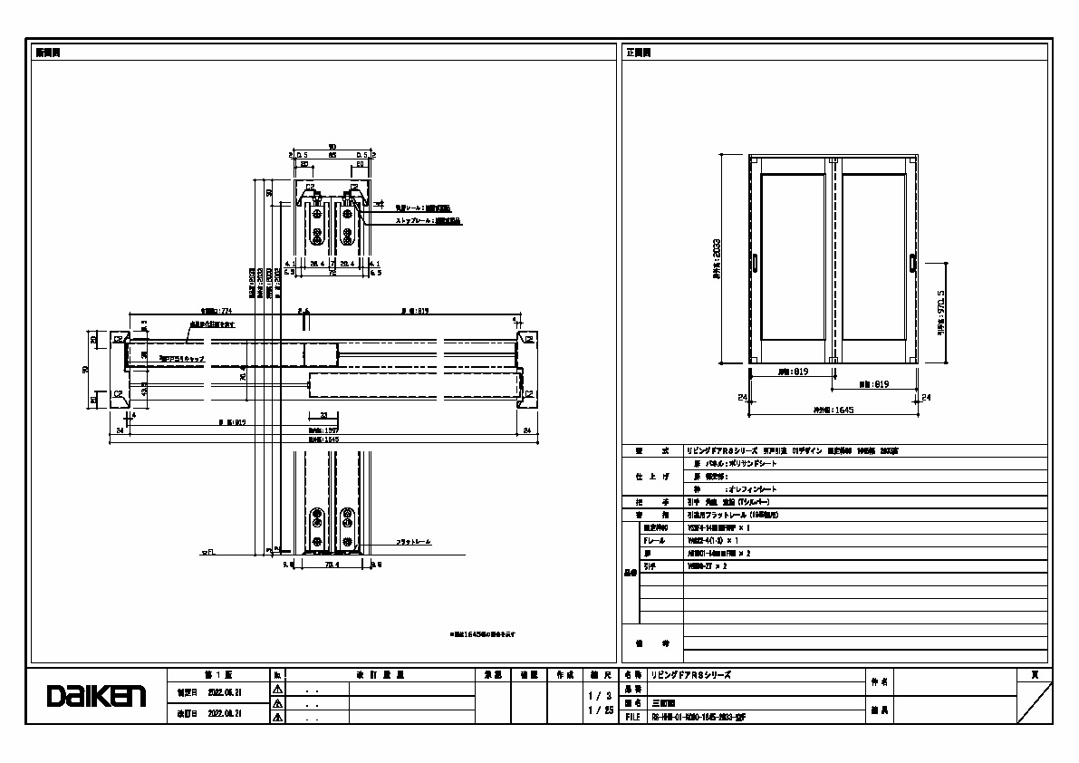 | キャプション | 1645幅 2033高 引手 角座 空錠 フラットレール(1645幅用) 三面図 |