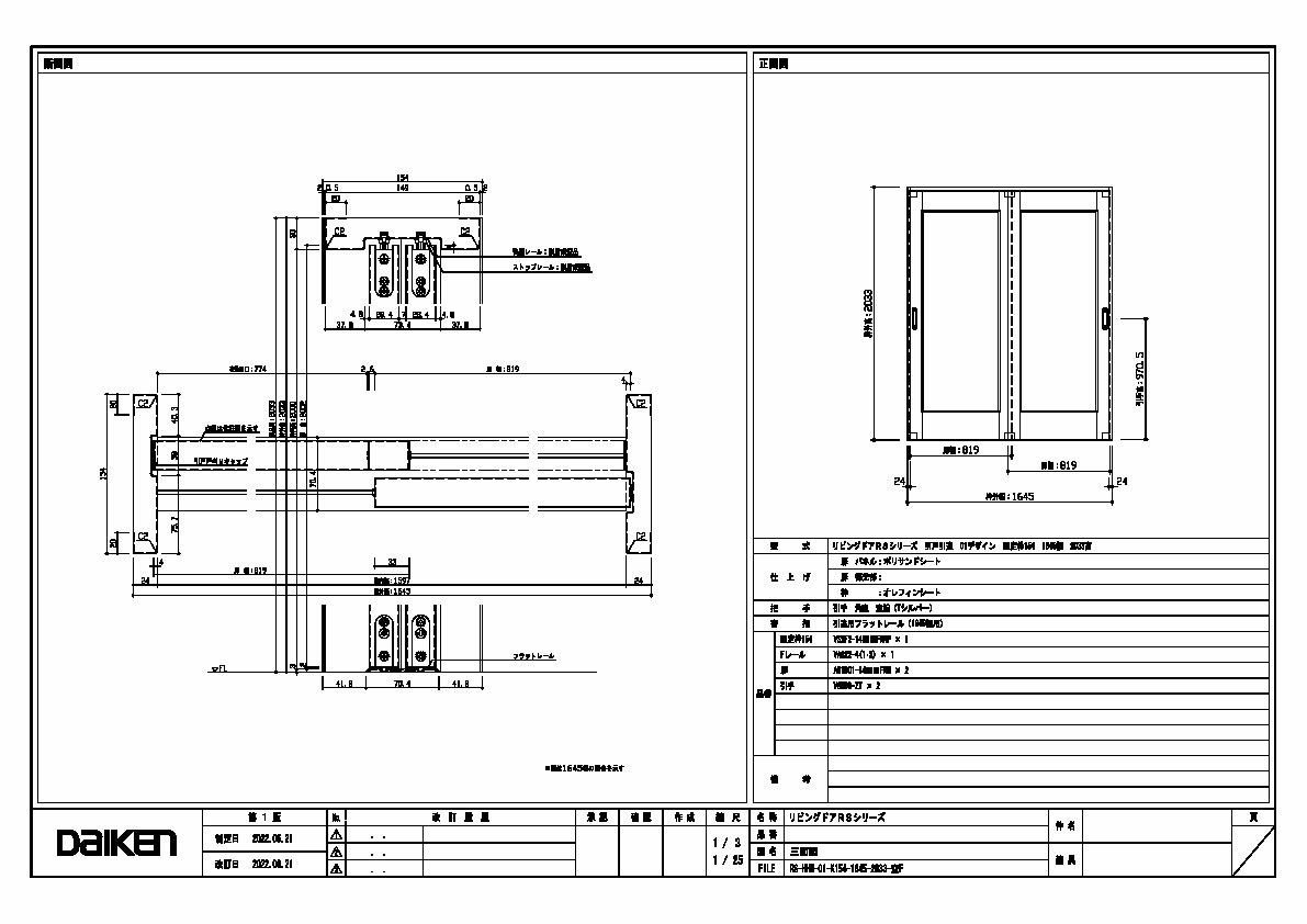 | キャプション | 1645幅 2033高 引手 角座 空錠 フラットレール(1645幅用) 三面図 |