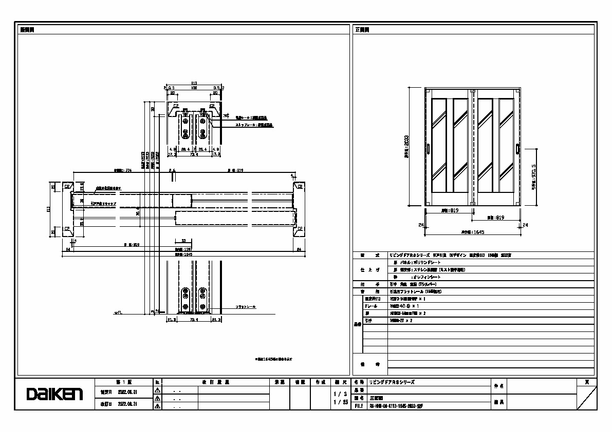 | キャプション | 1645幅 2033高 引手 角座 空錠 フラットレール(1645幅用) 三面図 |
