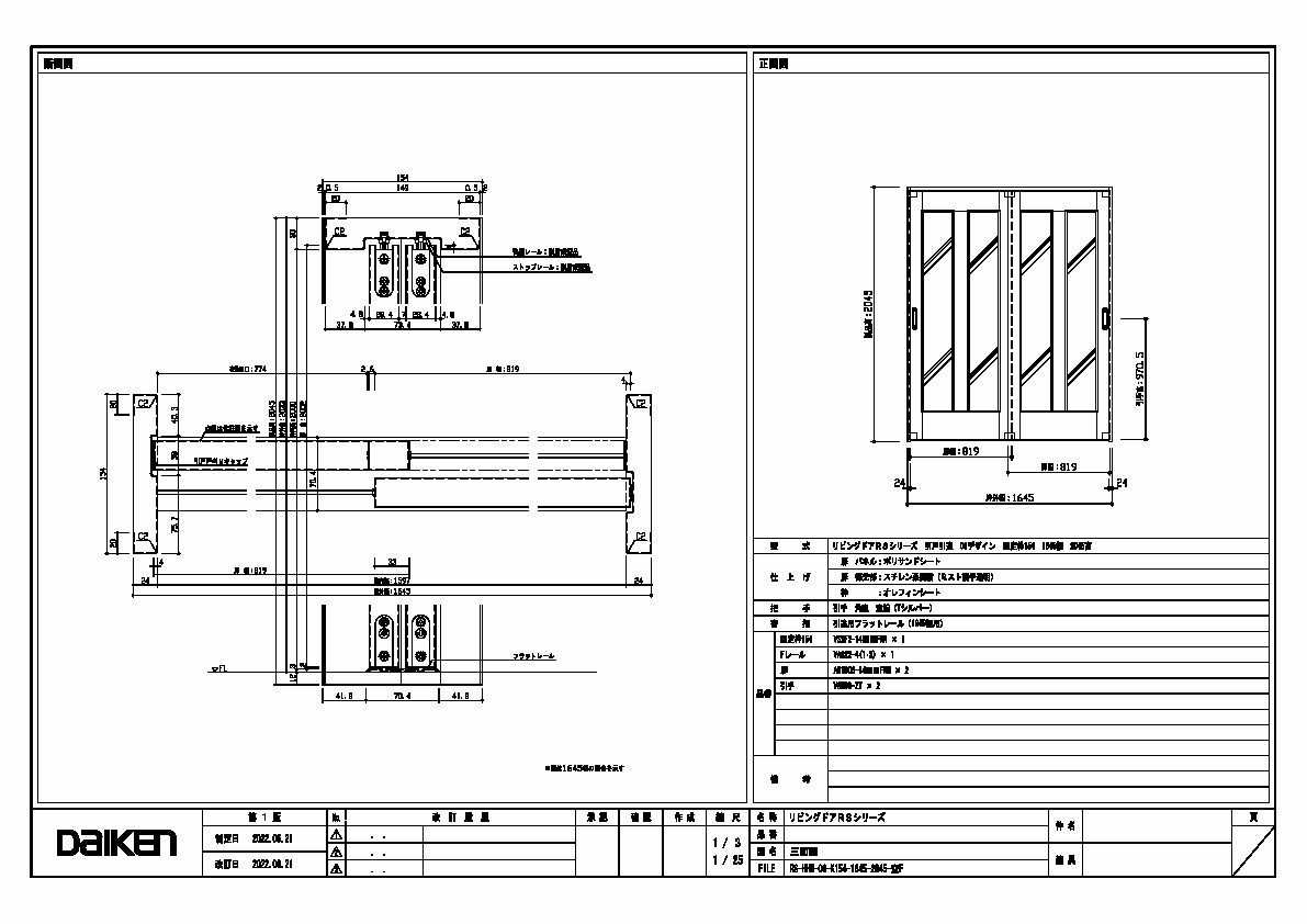 キャプション 1645幅 2045高 引手 角座 空錠 フラットレール(1645幅用) 三面図