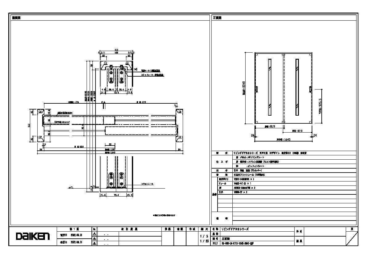 | キャプション | 1645幅 2045高 引手 角座 空錠 フラットレール(1645幅用) 三面図 |