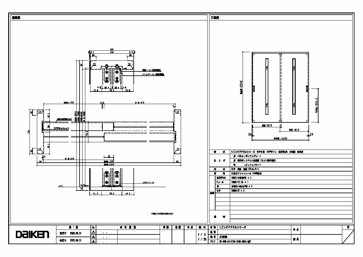 | キャプション | 1645幅 2045高 引手 角座 空錠 フラットレール(1645幅用) 三面図 |