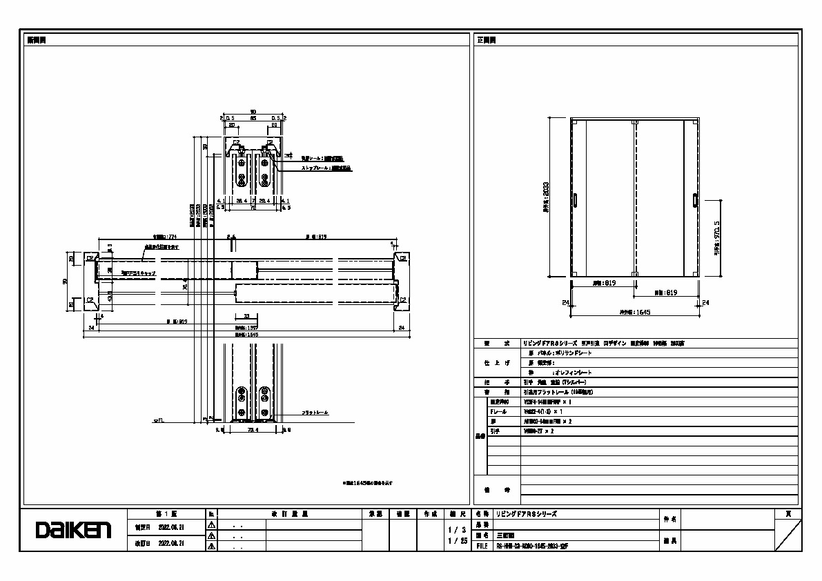 | キャプション | 1645幅 2033高 引手 角座 空錠 フラットレール(1645幅用) 三面図 |