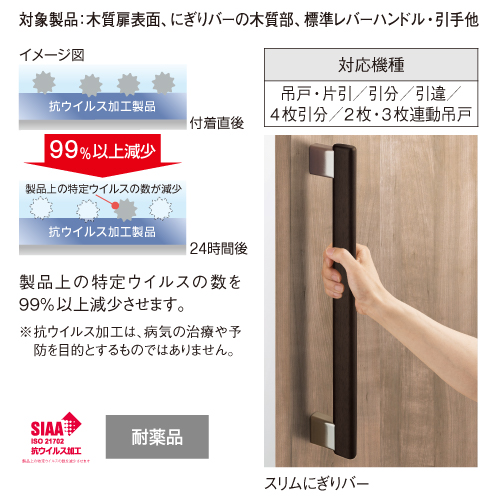 | キャプション | 抗ウイルス加工 抗ウイルス加工で、空気中や手から付着した、製品上の特定ウイルスの数を減少させ、様々な人が触れる部位も衛生的にお使いいただけます。 |