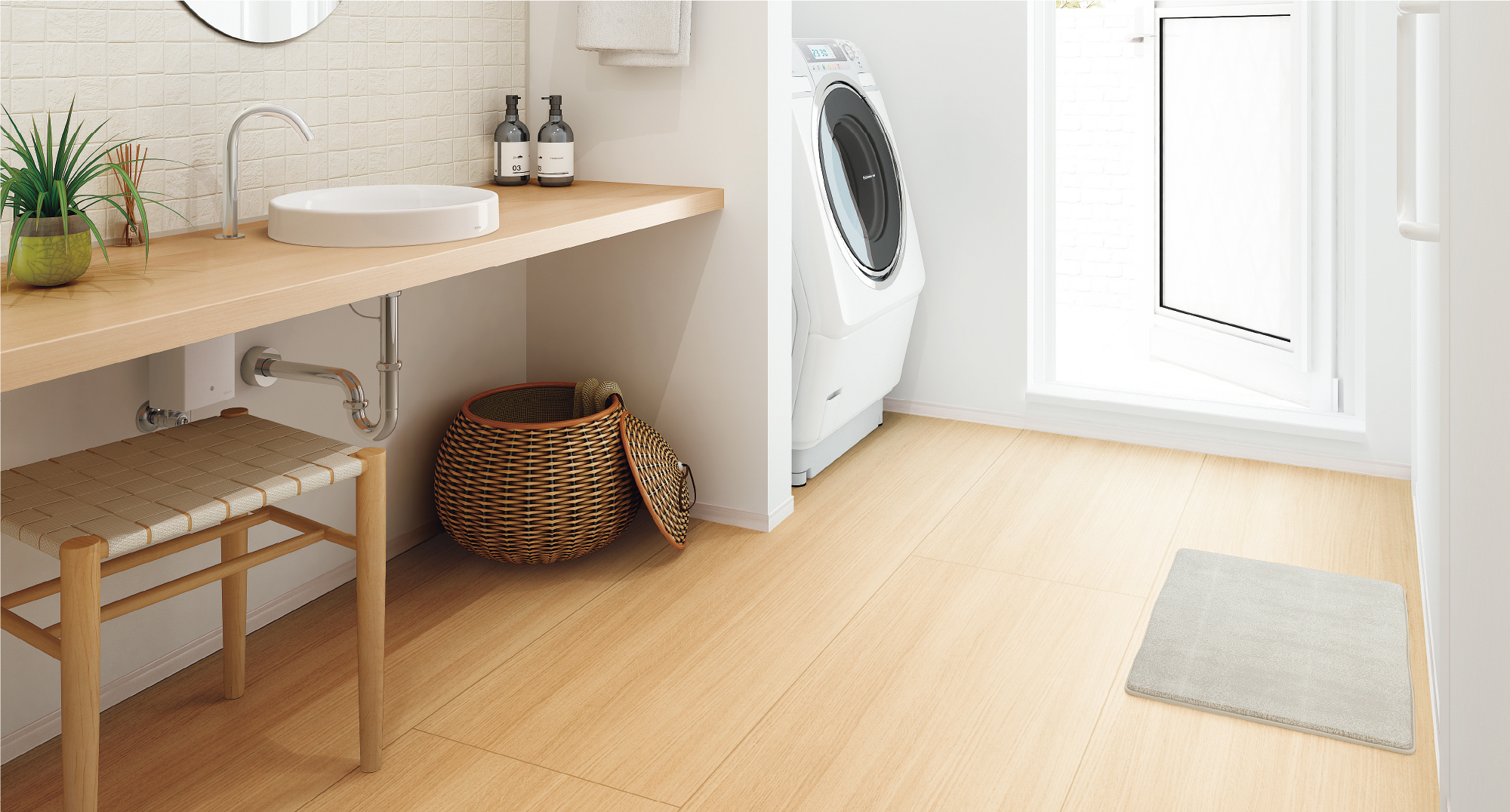 | キャプション | 床材:洗面専用フローリング スリップケア 〈ミルベージュ〉 |