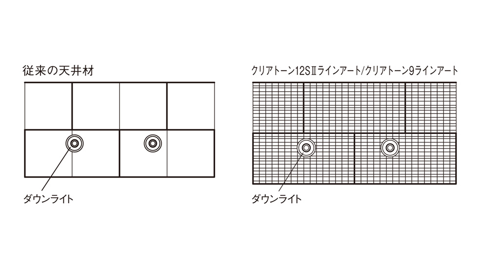 ■ダウンライト等の目地位置合わせが不要となり、配置が容易になりました。照明の配置を変えられない場合でも美しく仕上げることができます。