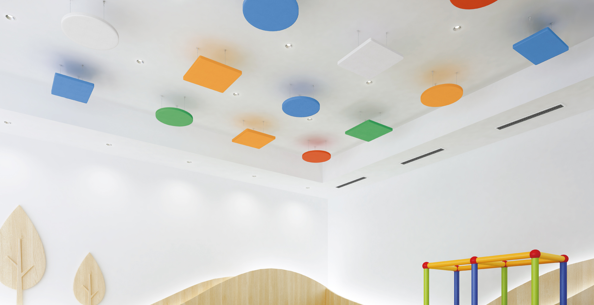 天井用吸音パネル:KIN TONE(キントーン) サークル(円形) 〈ブルー〉 〈レッド〉 〈イエロー〉 スクエア(四角形) 〈ブルー〉 〈イエロー〉 〈グリーン〉