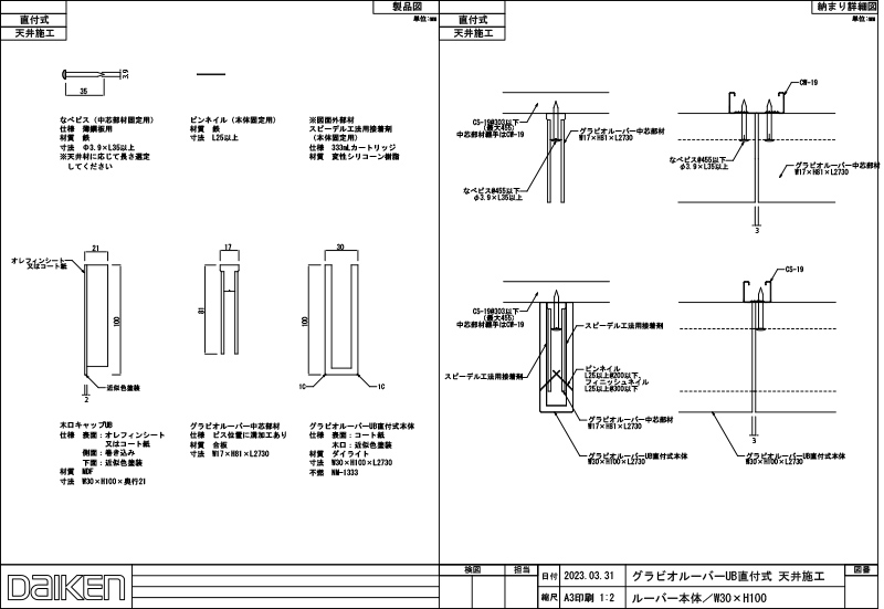 「ずっと ここちいいね」を実現する企業 DAIKEN 建材製品情報 CAD データ検索 dwg CD_B_MF01-01■■-0310.dwg dxf CD_B_MF01-01■■-0310.dxf CAD グラビオルーバーUB 直付式(天井施工)(幅×高さ:30㎜×100㎜) データ分類_第1分類 CAD データ分類_第2分類 内装ルーバー材 データ分類_第3分類 不燃造作材 データ分類_第4分類 グラビオルーバーUB データ分類_第5分類 直付式(天井施工) ファイル種類 姿図 キャプション グラビオルーバーUB 直付式(天井施工)(幅×高さ:30㎜×100㎜)