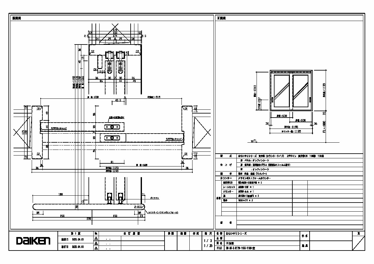 | キャプション | 1195幅 1133高 引手 角座 空錠 メラミンポストフォームカウンター |