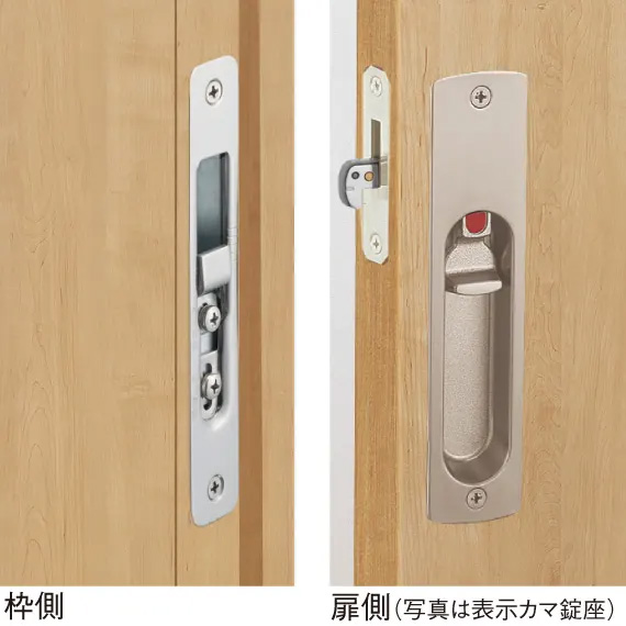 (6)カマ錠(ビス留めタイプ)\n片引タイプには、カマ錠付枠とカマ錠付扉をラインアップ。\n1745幅・1645幅・1450幅用扉には間仕切カマ錠座、1315幅・1195幅用扉には表示カマ錠座が標準設定です(カマ錠付の場合)。設定を変更することもできます。カマ錠座は金属製です。\n※ 巾広引戸用のセパレートカマ錠はオーダーになります。