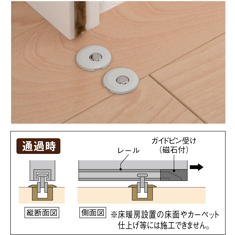 | キャプション | 下レールレス床埋込ガイドピン[オーダー] 扉が床埋込ガイドピンの上を通過するとピンがマグネットで引き出されて振れ止めとなります。 写真は2枚片引用 |