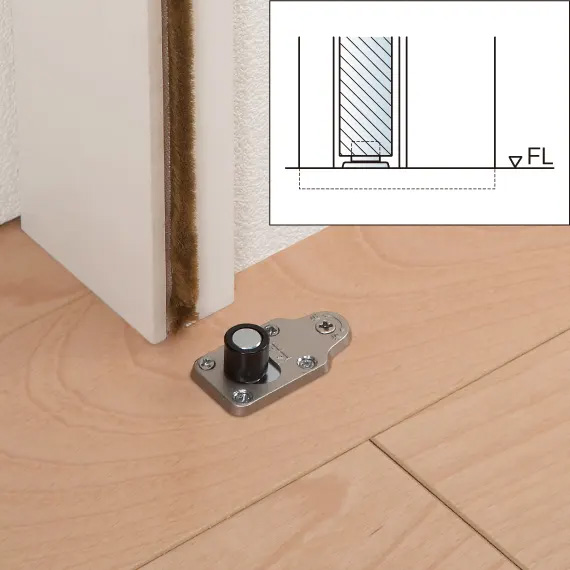 (2)床付ガイドピン\n扉の振れ止めのため、各吊戸枠にはガイドピンを同梱しています。\n※標準で枠に同梱(片引・引違・引分・4枚引違・引込用)\n振れ止めには床付ガイドピンを採用しています。\n・車イスでも通行しやすく、お掃除もラクラクです。\n・扉を吊ったまま前後調整もできます。\n写真は片引用