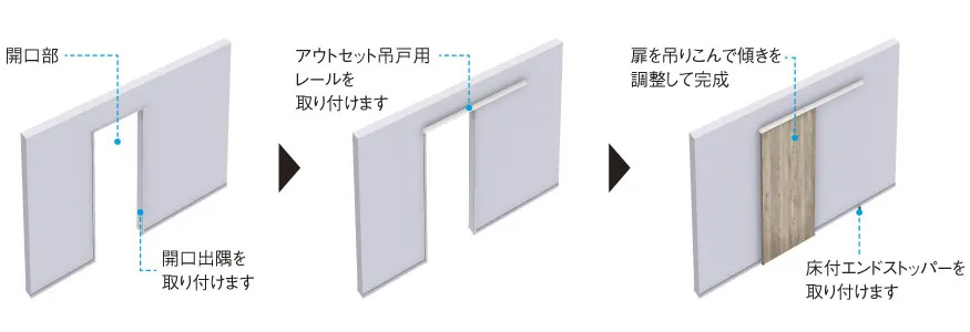 ラクラク施工\nもとからある躯体を利用するので控壁を作る手間が除けて省施工。\n※図はアウトセット吊戸・片引です。